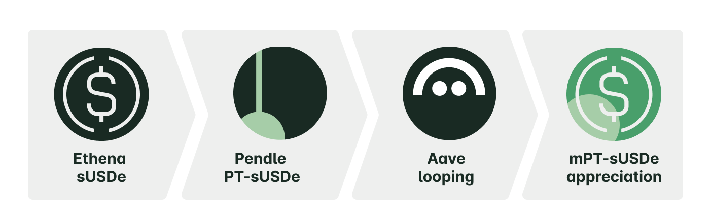 mStable takes the Pendle yield and multiplies it. Using Aave, the position is looped and optimized for higher returns.